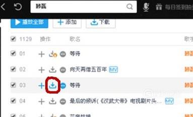 在每一首歌名前的下载图标上有人民币标志的是收费的,不想花钱就选没有这个标志的。我选第三行的“等待”,在前面的下载图标上点一下。