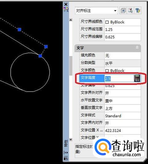 如图所示,在特性面板中修改文字高度,就可以改变标注字体大小了。
