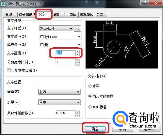 在出现的面板中,点击“文字”标签,然后修改文字高度,如图所示,就可以改变标注字体大小了。