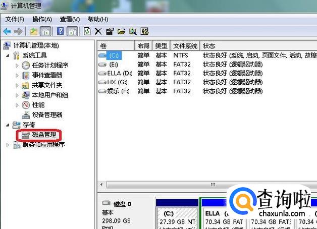 进入计算机管理界面,如图所示,我们点击“磁盘管理”,就能看到当前计算机的所有磁盘分区。