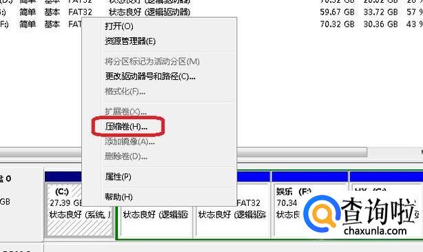 在下方磁盘区任意选一个磁盘进行再次分盘,比如我选择C盘,右键点击C盘后,选择“压缩卷”。