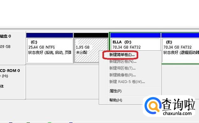这样,磁盘区就会多出一个未分配空间,我们右键点击,选择“新建简单卷”。