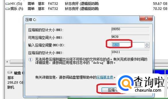 系统会计算该磁盘可以用的压缩空间,如图所示,我们输入一个不大于9639M的数,点击压缩。
