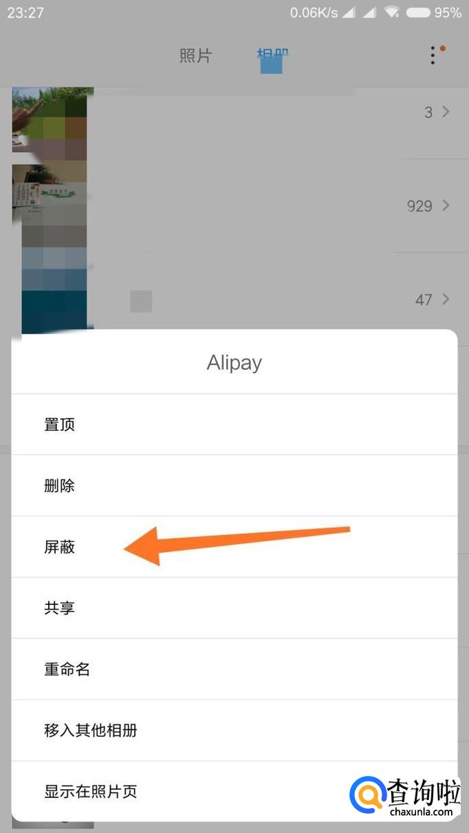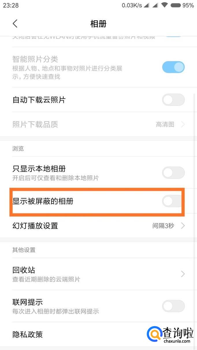 在设置里面找到“显示被屏蔽的相册”,回到相册界面即可看到被屏蔽的相册。