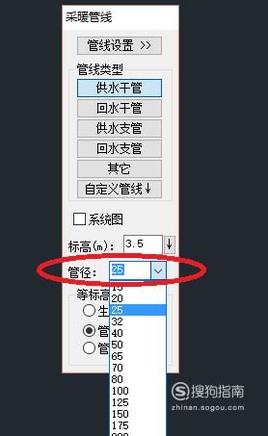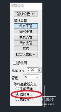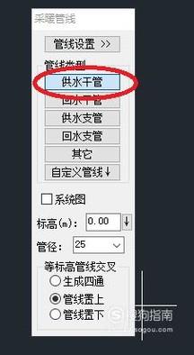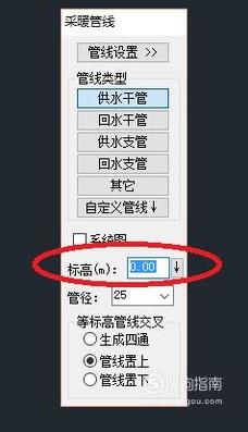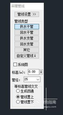 打开墙体“采暖管线”编辑界面,依次选择自己需要的“管线类型”、“标高”、“管径”、“等标高管线交叉”,如下图所示