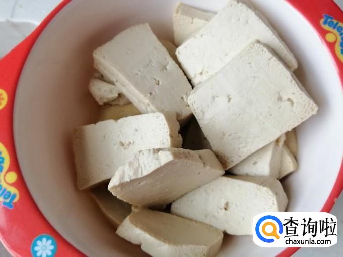 取适量新鲜的豆腐,把豆腐切成两厘米大小的薄片,切好待用,不要把豆腐切的太厚,那样不容易入味。