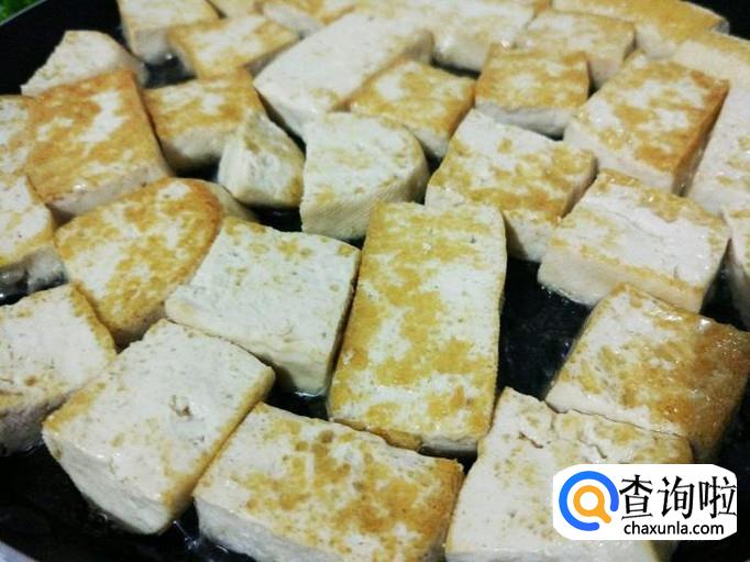 铁板上放适量植物油,把需要烧的豆腐平铺在铁板上,把豆腐两面烧至微黄,一定要勤翻,不要把豆腐烧糊了。