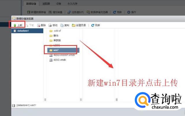 接下来在弹出的数据存储浏览器界面中我们新建一个win7的目录,然后点击上传按钮,如下图所示