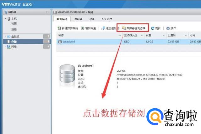 首先我们打开Vmware ESXI软件,选择左侧的存储选项,然后点击数据存储浏览器,如下图所示