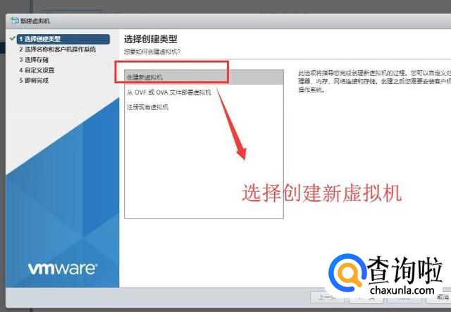 然后在弹出的新建虚拟机界面中选择创建类型为创建新虚拟机,如下图所示