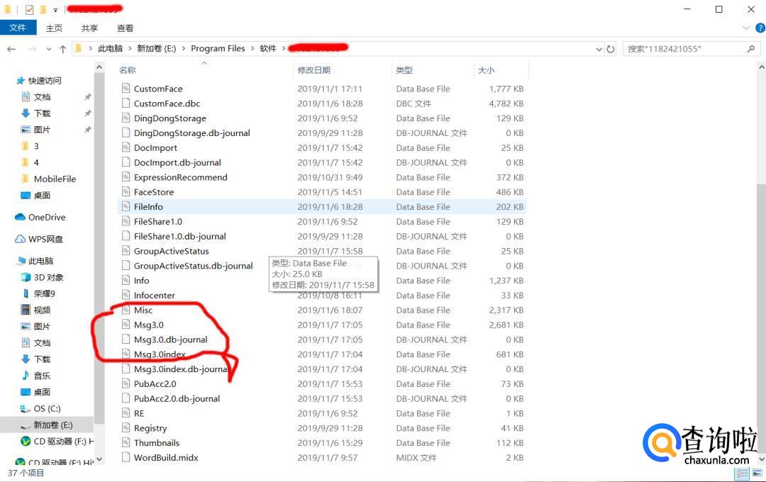 进入以qq命名的文件夹,找“Misc.db”,“Msg2.0.db”,“Msg3.0.db”三个文件,如图,文件夹里有这些文件,聊天记录还在,若不在就是删除了聊天记录,从回收站恢复即可。