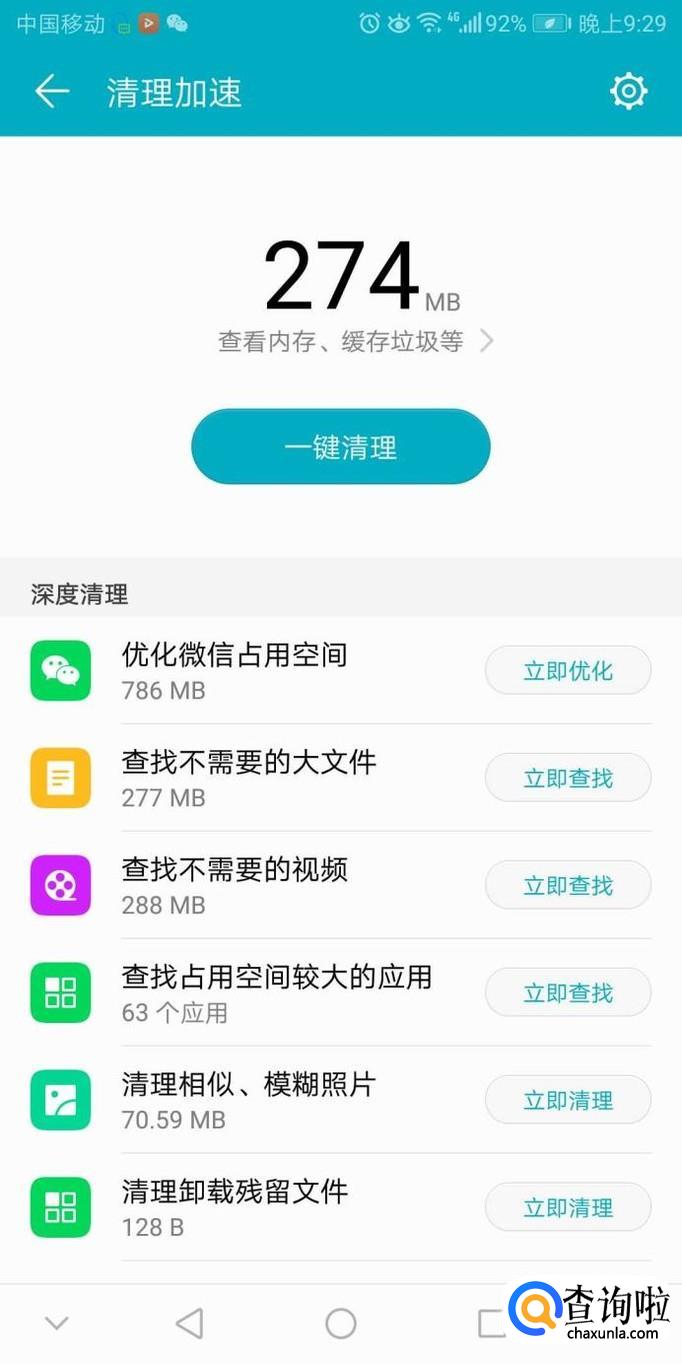 系统提示成功清理缓存垃圾,手机空间很充足,可放心使用。