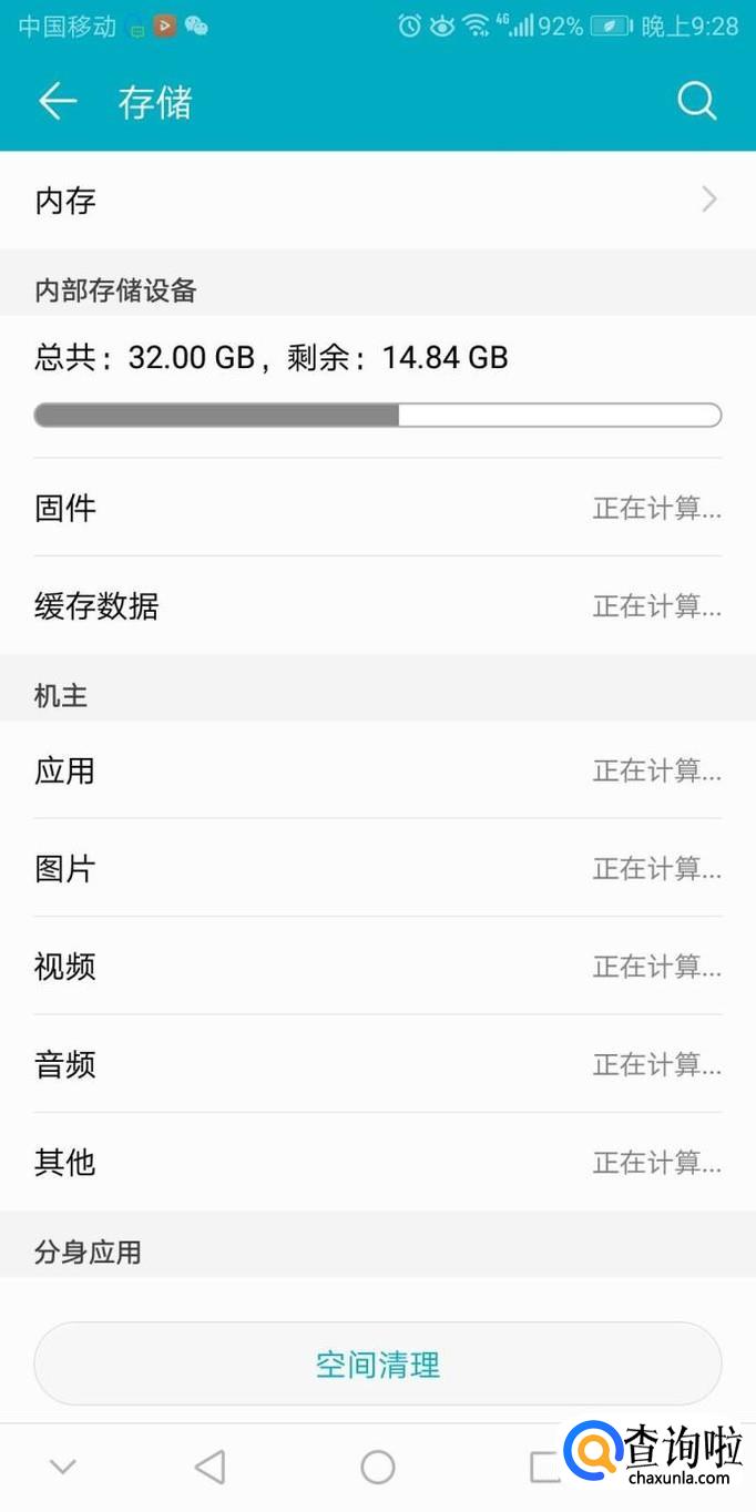 系统会自动计算内部存储空间的大小,点击下方的空间清理。