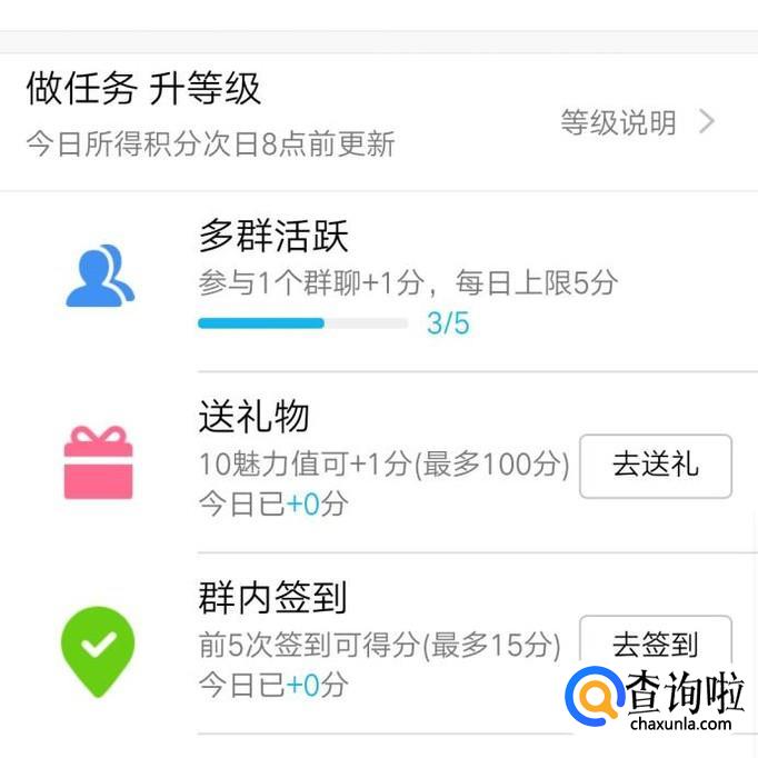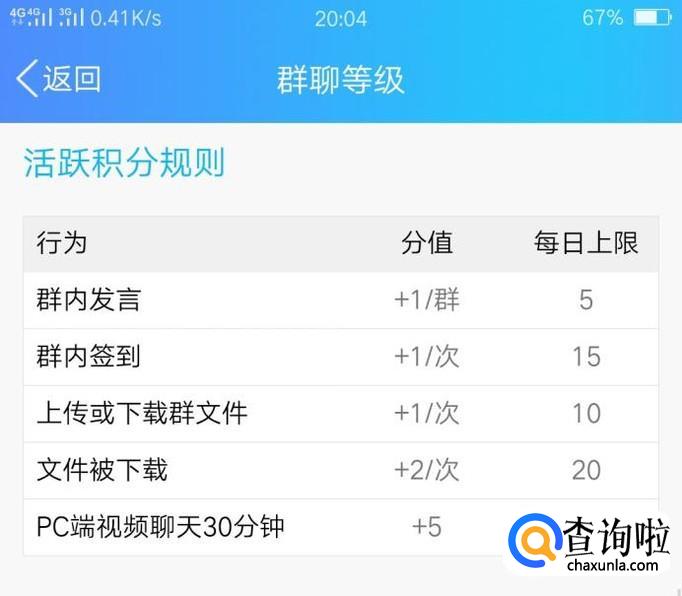 在群里活跃就可以加分,主要有:群内发言、群签到、上传或下载群文件等都是可以加分的,所以想要提升等级,一定要活跃哦!如果在群里不积极,超过七天没有发言,就会扣积分,所以要活跃哦!