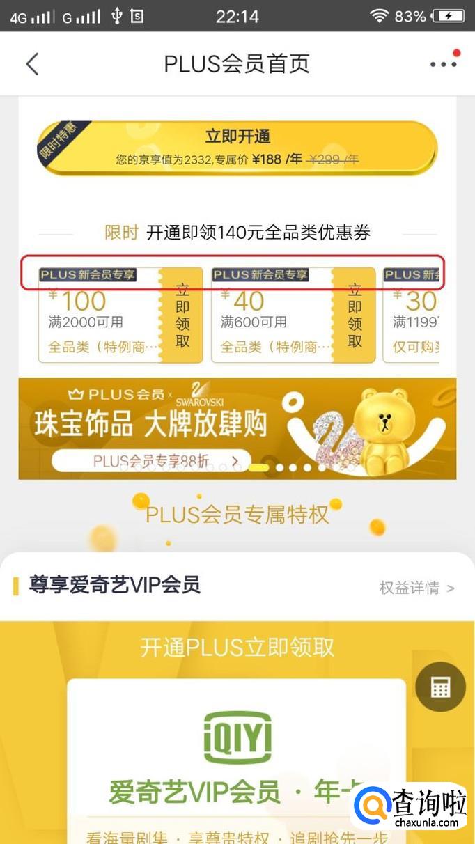 此外,第一次开通PLUS还会有新会员专享的额外优惠券赠送。