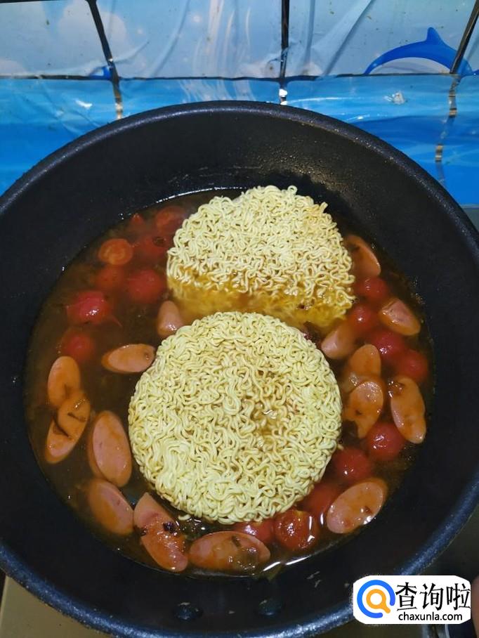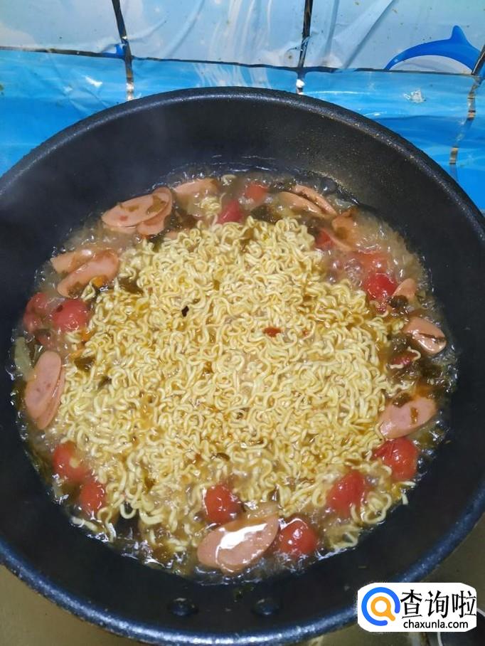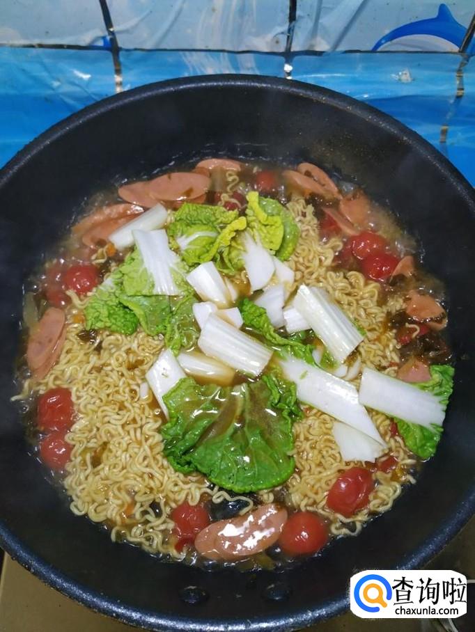 加入两块面饼,没有面饼的也可以加入面条,加入适量青菜,大约煮4分钟左右。