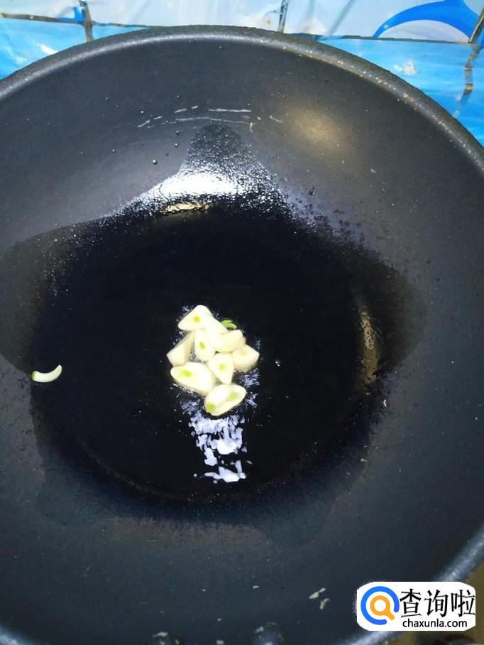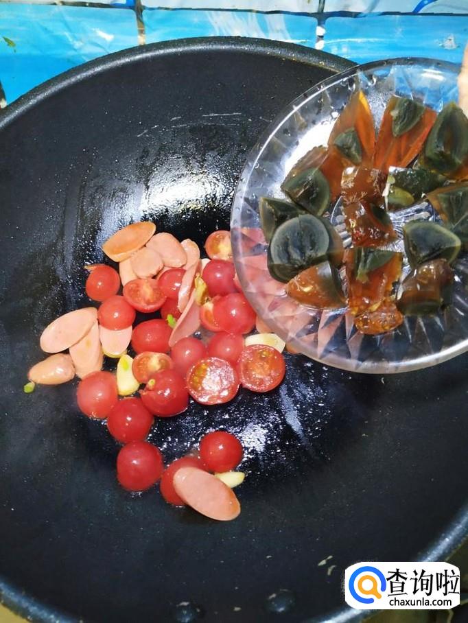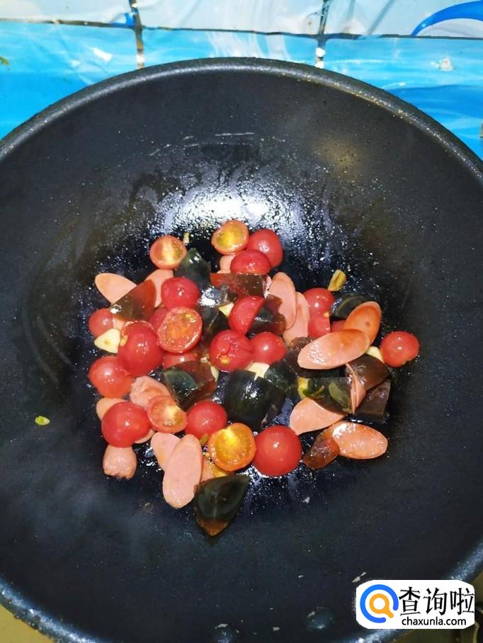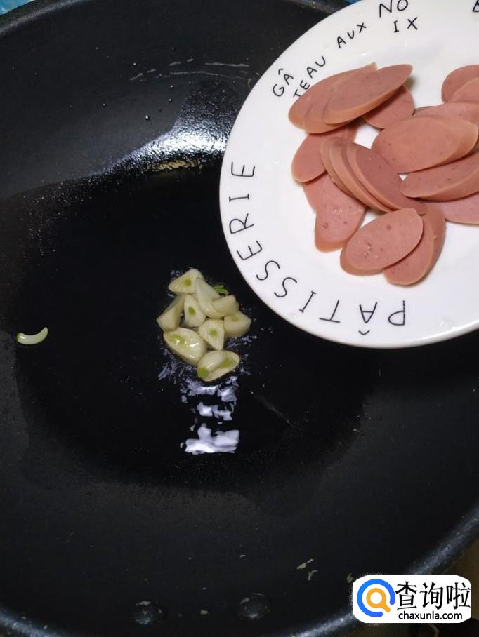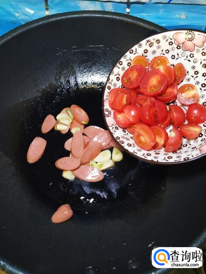 准备适量蒜,洗净后切片,炒锅中放入适量油,油热后,放入蒜片爆香,然后将切好的香肠和圣女果放入锅中,翻炒均匀。