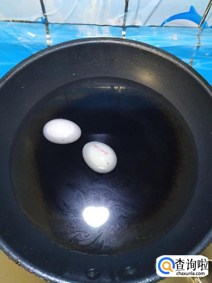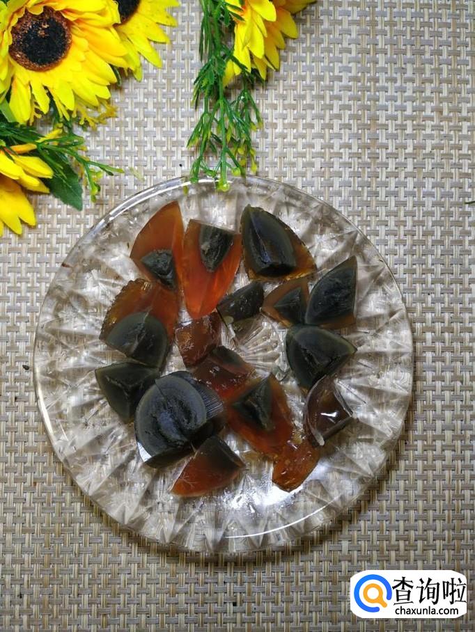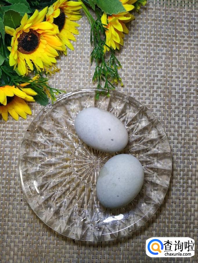 准备两个松花蛋放入锅中,煮4到5分钟,捞出过凉水,去壳后,切成小块,放入盘中备用。