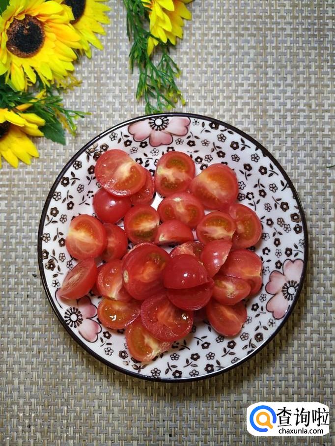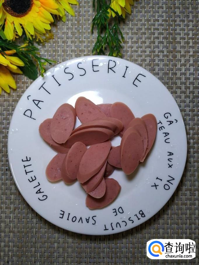 准备适量圣女果,洗净后,对半切开,放入盘中备用,再准备适量香肠,切成片备用。