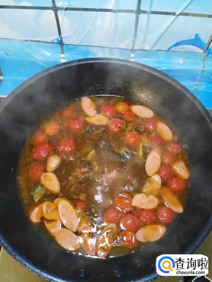 准备适量酸菜和辣椒酱,倒入锅中,大火将水烧开,水开后,转小火煮4到5分钟。