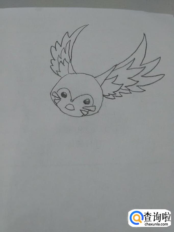 耳朵是分层的,像一层层翅膀上的羽毛,先画第一层,在头顶左右两方各画几个锯齿形状。