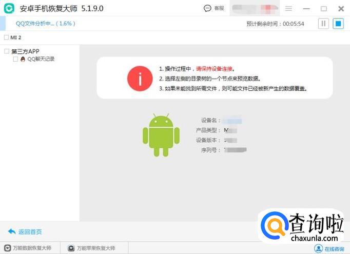 开始进入扫描手机上的QQ聊天记录,时间大小根据手机内存而定,不要去操作手机,直到数据扫描结束。