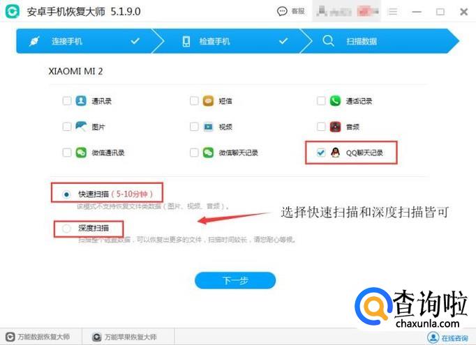 连接已经root过的安卓手机到电脑上,然后运行安装好的数据恢复软件。待软件和电脑连接成功后,选择要恢复的类型,勾选最下面的“QQ聊天记录恢复”,点击下一步。