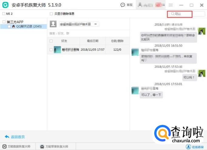 完成数据扫描后,在界面上点击QQ聊天记录,进入详细的页面,可以清晰的看到联系人,和对应的联系人聊天记录。可以在搜索框中输入关键字去查找自己要的聊天记录。