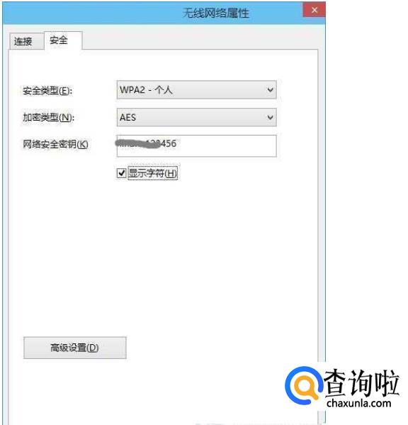 弹出【无线网络属性】对话框,切换到【安全】选项卡,并勾选上【显示字符】,就可以查看到网络安全秘钥,也就是Wifi密码了,如下图所示。
