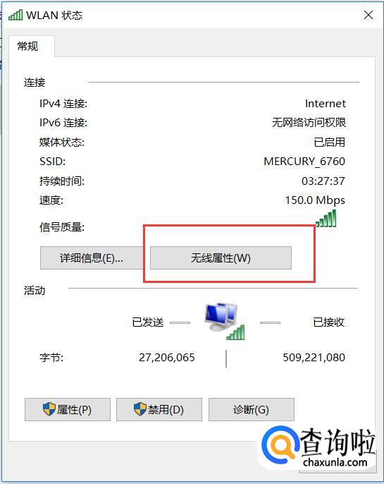 在弹出的【WLAN状态】对话框中,点击【无线属性】,如下图所示。
