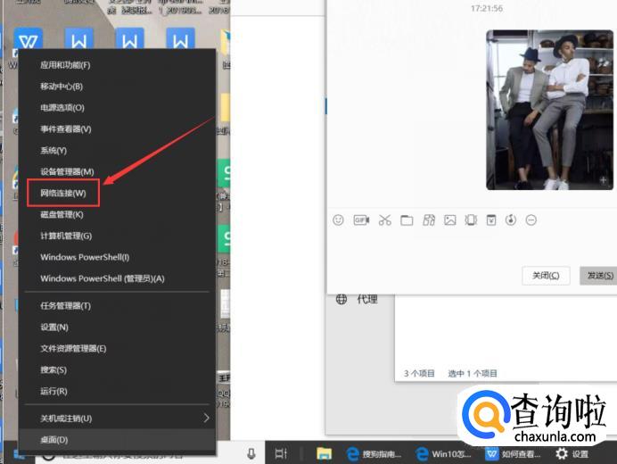 在Windows 10桌面最左下角的【Windwos开始图标上右键】,在弹出的菜单中点击打开【网络连接】,如下图所示。