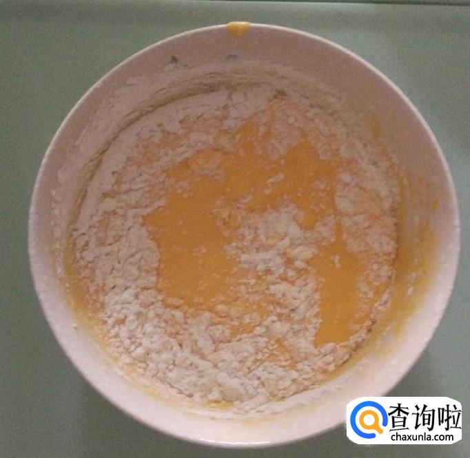 先打蛋黄(或者蛋清,都可以),将蛋黄打细腻,加酸奶(根据个人喜好,喜欢嫩一点的加多点,老一点的加少点),加入面粉,搅拌成糊状(干一点的糊)