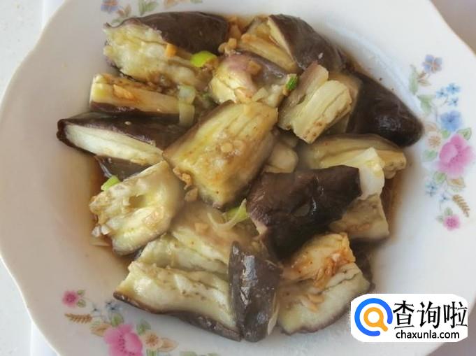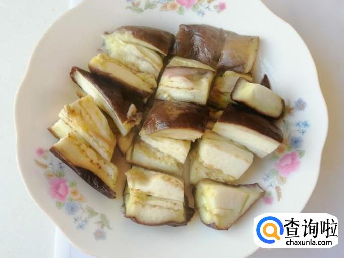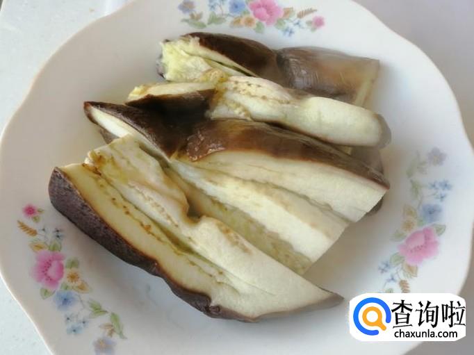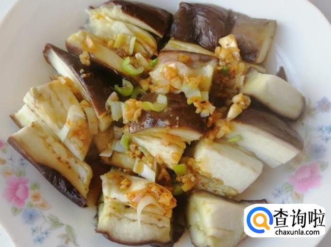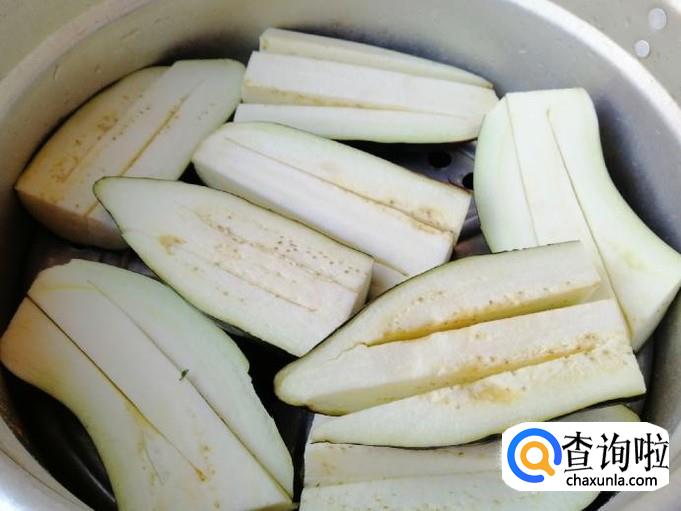 开锅上气八分钟左右,茄子就熟了,打开锅盖,把蒸好的茄子盛入盘中,用刀在盘中切两刀,切成小块比较方便食用。