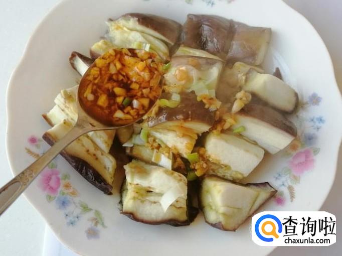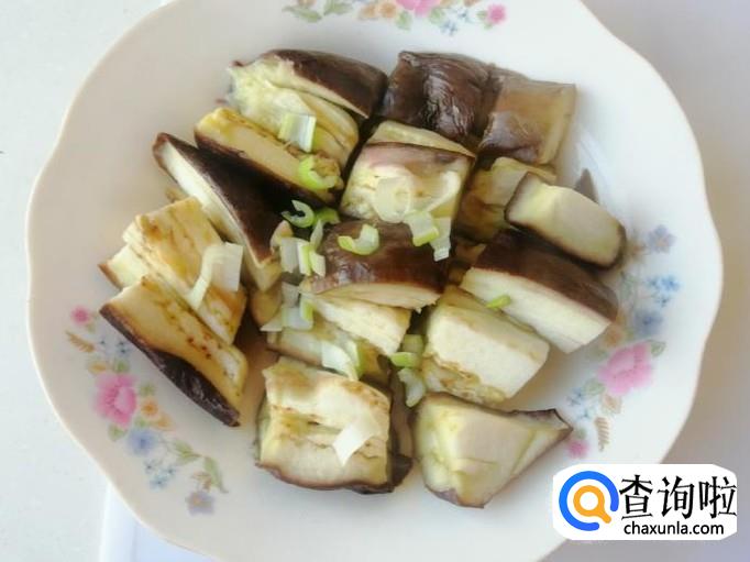 把切好的熟茄子上,撒些葱末,然后浇上调制好的蒜汁,用量根据自己口味添加,最后用筷子搅拌均匀,这样我们的,蒜汁拌蒸茄子就做好了,上桌开吃。