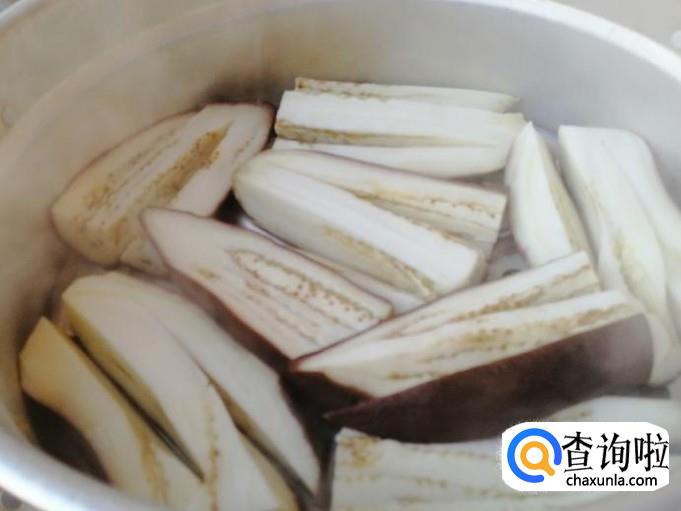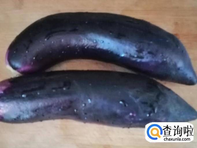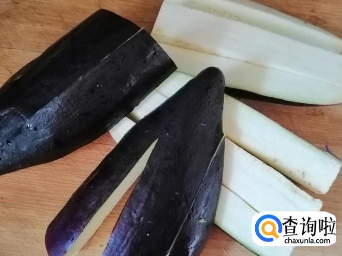 选用新鲜的两个长茄子,用清水把茄子洗净,然后把茄子放在菜板上,用刀切开一分为二,然后如图所示,取四份之一块茄子,从一头划一刀不切断,掉过头再划一刀,切好待用。