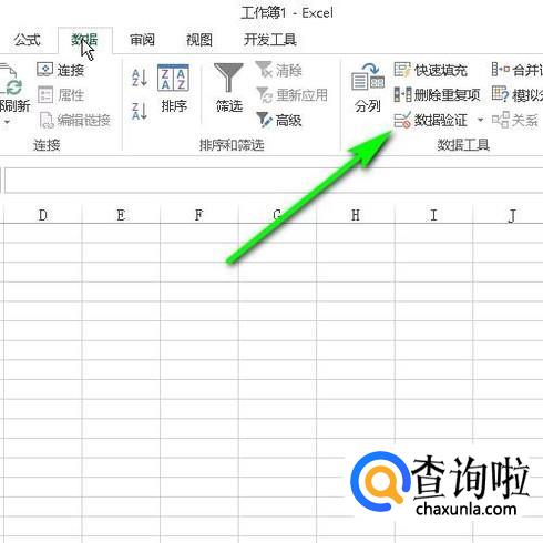 那么,下面即展开了与数据相关的功能组,找到并点击:数据验证