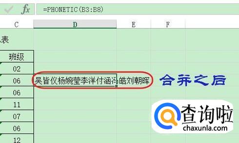 针对以上第二种情况的合并,我们还可以利用PHONETIC函数,我们同样选择一个空白单元格,然后输入“=PHONETIC(要合并的单元格)”,点击回车那么刚才的单元格数据就合并到新的空白单元格了(注:此方法不适用合并数字,只可合并文本和字母)