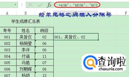 这样前面几个单元格的数据就合并到一起了,如图所示...如果我们还想在内容之间插入分隔号,那么 刚才的公式变为“=A3&"、"&B3&"、"&C3”即可;