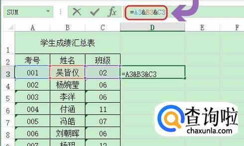 首先我们选中D列某个单元格,然后输入公式“=A3&B3&C3”(也就是前面三列单元格),如图二...