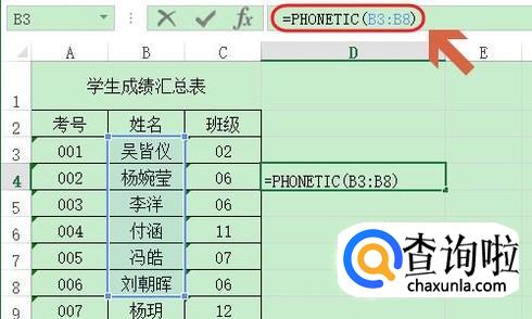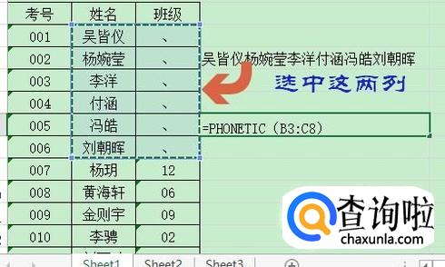 然后重新选中一个空白单元格,依然输入函数“=PHONETIC()”,不过这次括号内的内容要连同分隔号一起选中才行,图二就是添加了分隔号以后的效果;