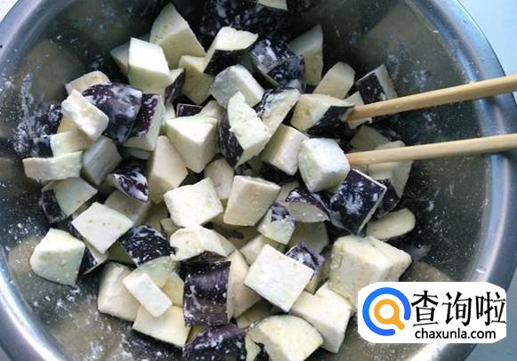 往茄子上淋一勺水(或者打个鸡蛋进去拌匀),然后倒入适量淀粉后拌匀。