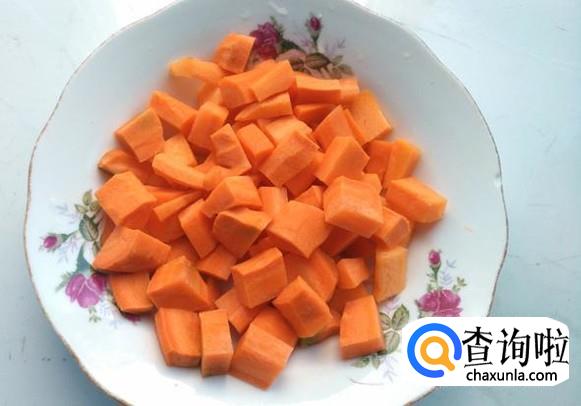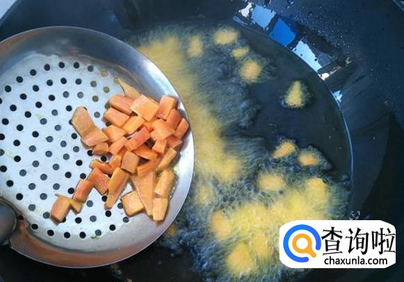 锅内烧油,当加热到插入干筷子就起泡时就可放入胡萝卜丁炸制,炸至表面呈微焦色就可捞出备用。