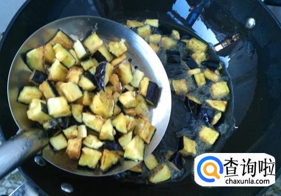将茄丁也放入油中炸制,炸到表面呈微焦色后捞出。