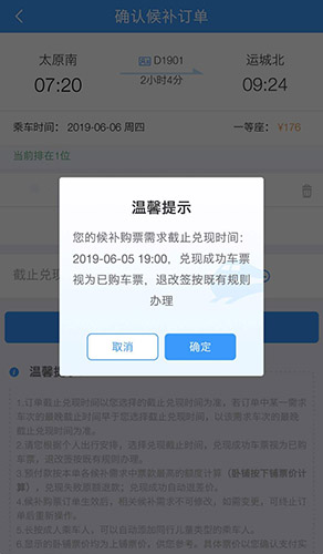在确认候补订单环节,旅客可以填入乘客信息确认提交,在30分钟内付款即可。在这一环节,旅客需要设定一个截至兑现的时间,设定时间截止后,系统将不再为旅客排队候补车票,无票退款。兑现成功或自动终止时,将通过您选择的通知方式进行告知,请注意查收消息并关注“候补订单”兑现状态。铁路部门提示,兑现时,将根据旅客所候补列车的席位实际情况予以分配,多人出行时,可能分配到不同车厢,遇有卧代座时,将按坐席予以分配。兑现车票视同旅客购票,遵守实名制等相关规定。候补购票的概率还是很大的。截至2019年1月30日,候补购票兑现成功率接近80%。5月22日起,候补购票扩大至所有旅客列车。