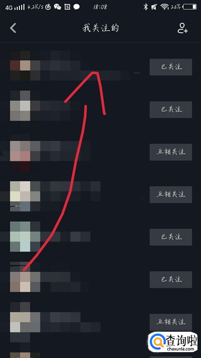点击“关注”选项,如图1箭头所示。你会看到出现一个新的界面,点击你关注的一个人。