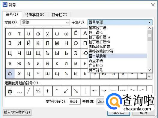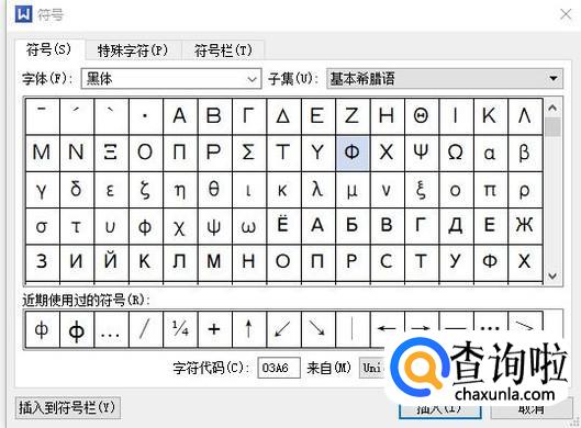 “字体”选中“黑体”,“子集”选中“基本希腊语”,既可找到“Φ”。