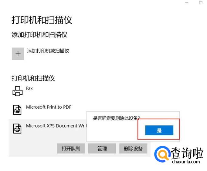 最后,在弹出的对话框中,点击“是”按钮,即可删除已经安装的打印机设备。