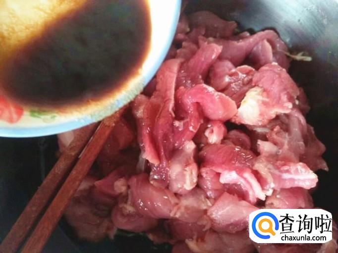 用筷子将猪肉和这些调料以及葱姜蒜进行搅拌,争取每一片肉上都沾上调料让其更好的入味,搅拌均匀之后盖上盖子腌制半小时或者二十分钟都可以。