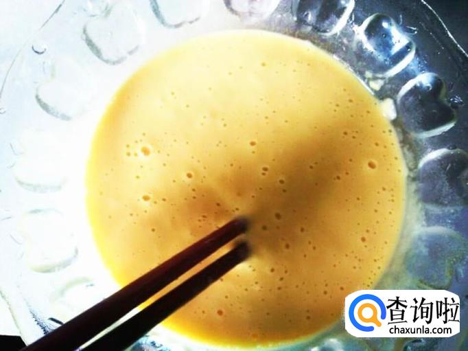 再加上一点清水,然后用筷子将鸡蛋打散,并且搅拌的没有一点颗粒,调成鸡蛋糊待用。