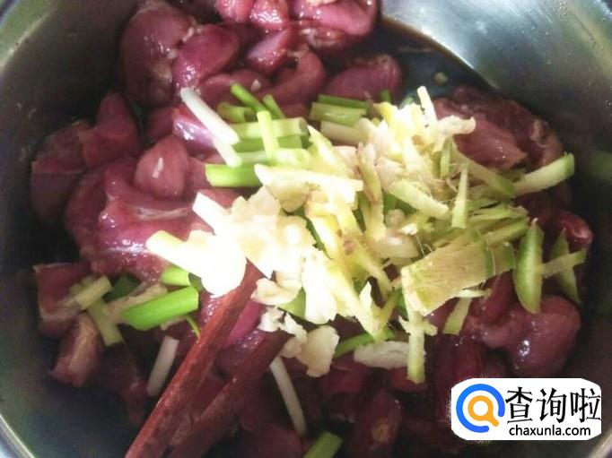 准备葱姜蒜,小葱切成大段,生姜成妾丝,大蒜直接用刀拍碎就可以,全部放进猪肉里。